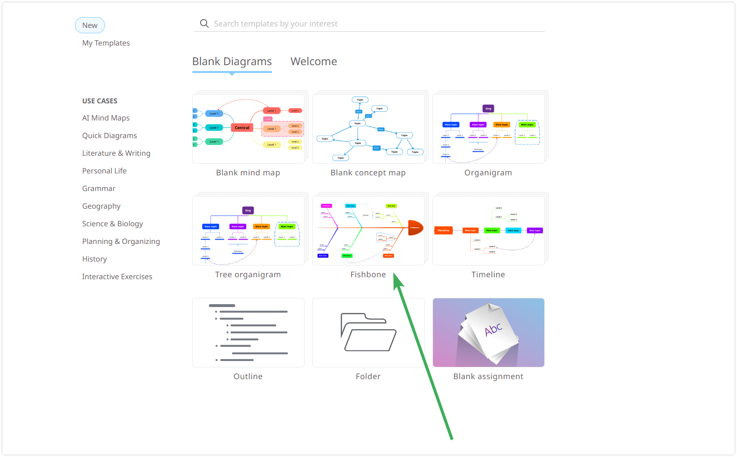 Mindomo is a diagramming tool that allows you to create fishbone diagrams and other types of diagrams (mind maps, concept maps, timelines, organigrams, outlines, Gantt charts, etc.) from scratch or using a template. Creating a fishbone diagram from scratch means you can use the fishbone layout as a template.