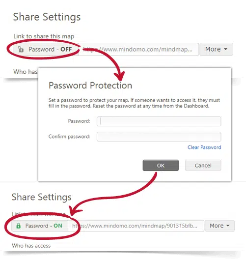 Link sharing was simplified too, you have all the options in one page: you can make your mind map public and viewable for everyone on the internet, viewable only for those who have the link, or guest editable.