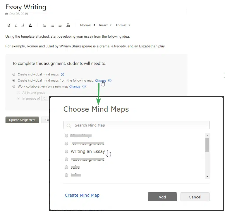 To add a template to your assignment, you will simply need to attach it while setting up the assignment. First of all, click on “Choose”, then select the template from the list of mind maps created on your account.