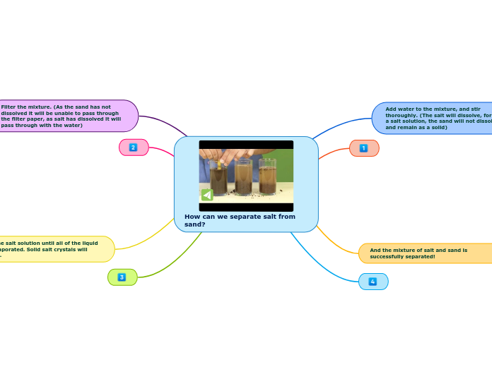 Add water to the mixture, and stir thoroughly. (The salt will dissolve, forming a salt solution, the sand will not dissolve and remain as a solid)