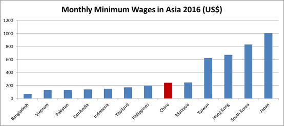 As seen by this graph, Bangladesh is one of the few Asian countries that has very low minimum wage rates. This is a huge factor when it comes to companies outsourcing/globalizing because Bangladesh is one of the most common countries known for production. With the minimum wage being at its lowest, companies take this as an opportunity to outsource their company and pay very low labour costs which leads to Bangladesh being one of the top countries with high exploitation rates.