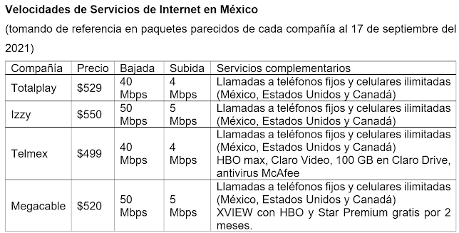 (tomando de referencia en paquetes parecidos de cada compañía al 17 de septiembre del 2021)