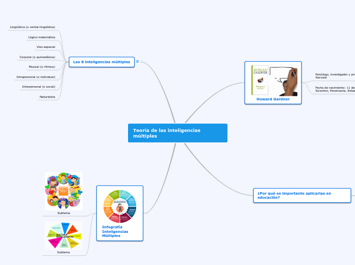Lingüística (o verbal-lingüística): Habilidad para utilizar con un dominio avanzado el lenguaje oral y escrito, así como para responder a él. Por ejemplo los políticos u oradores de prestigio.Lógico-matemática: Habilidad para el razonamiento complejo, la relación causa-efecto, la abstracción y la resolución de problemas. Por ejemplo un campeón de ajedrez o científicos.Viso-espacial: Capacidad de percibir el mundo y poder crear imágenes mentales a partir de la experiencia visual. Por ejemplo fotografía, video, creatividad 3D, etcCorporal (o quinestésica): Habilidad de utilizar el cuerpo para aprender y para expresar ideas y sentimientos. Incluye el dominio de habilidades físicas como el equilibrio, la fuerza, la flexibilidad y la velocidad. Ejemplo: Danza o gimnasia.Musical (o rítmica): Habilidad de saber utilizar y responder a los diferentes elementos musicales (ritmo, timbre y tono). Por ejemplo los músicos.Intrapersonal (o individual): Habilidad de comprenderse a sí mismo y utilizar este conocimiento para operar de manera efectiva en la vida. Por ejemplo los psícologos y filósofos .Interpersonal (o social): Habilidad de interactuar y comprender a las personas y sus relaciones. Por ejemplo las personas solidarias, miembros de ONGs, campañas de ayuda a refugiados, etcNaturalista: Habilidad para el pensamiento científico, para observar la naturaleza, identificar patrones y utilizarla de manera productiva. Por ejemplo científicos volcados en el naturalismo y la defensa de la naturaleza.http://www.ceolevel.com/8-inteligencias-la-teoria-de-las-inteligencias-multiples