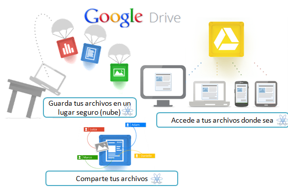 Google Drive permite almacenar, crear, modificar, compartir y acceder a documentos, archivos y carpetas de todo tipo en un único lugar: la Nube. Tendrás acceso a los archivos vía Web, desde tu dispositivo móvil o desde tu equipo de cómputo de escritorio o portátil. ➢ Crear, añadir o subir un archivo con un solo botón.