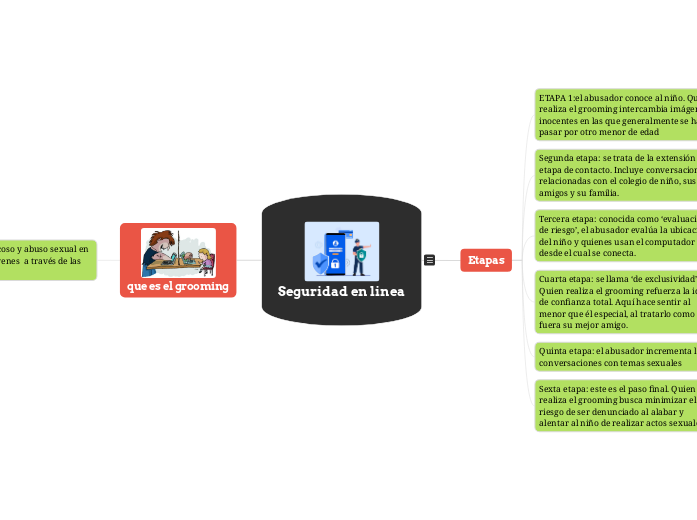Sexta etapa: este es el paso final. Quien realiza el grooming busca minimizar el riesgo de ser denunciado al alabar y alentar al niño de realizar actos sexuales.
