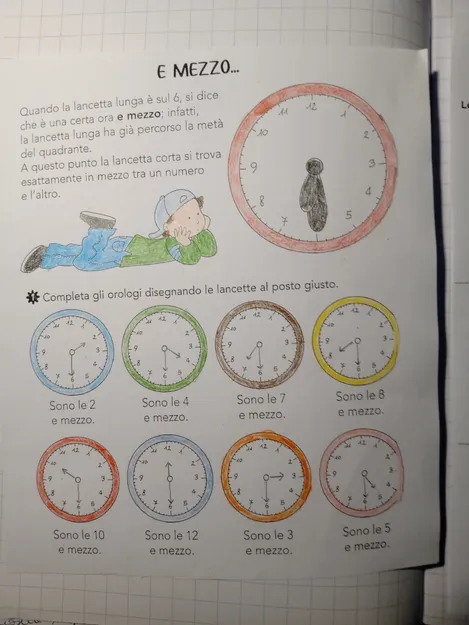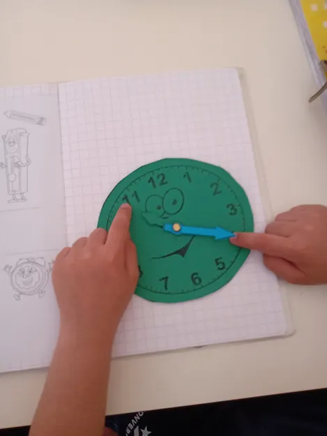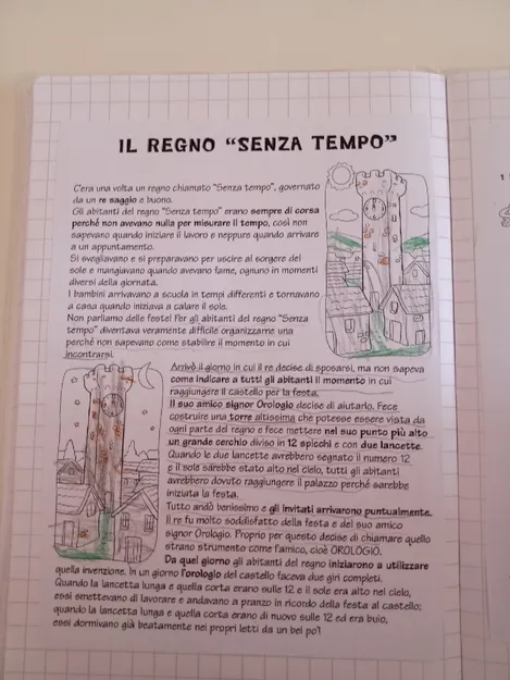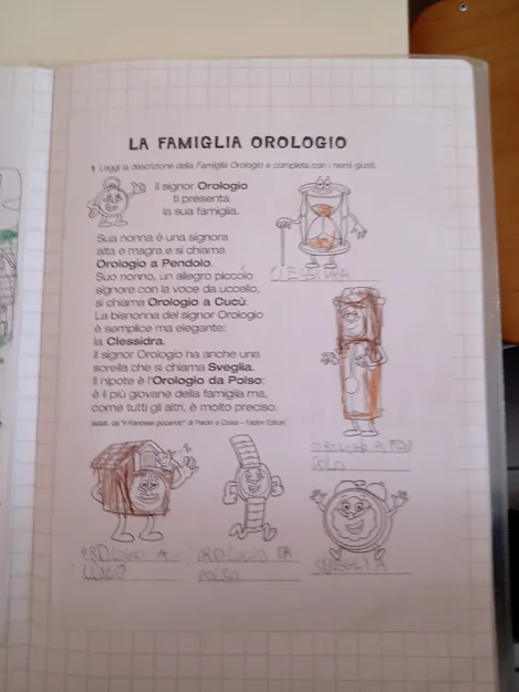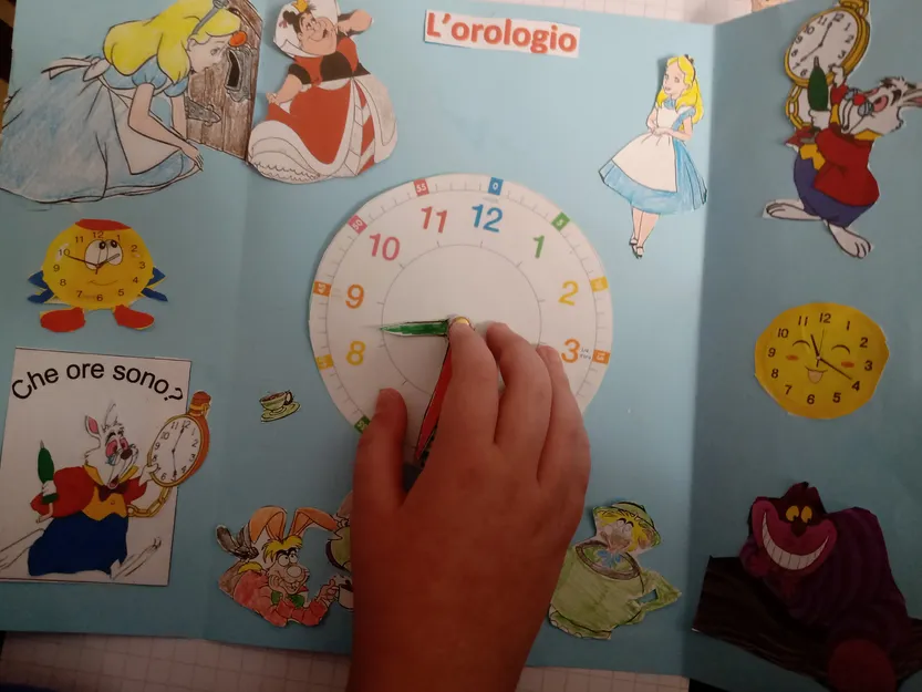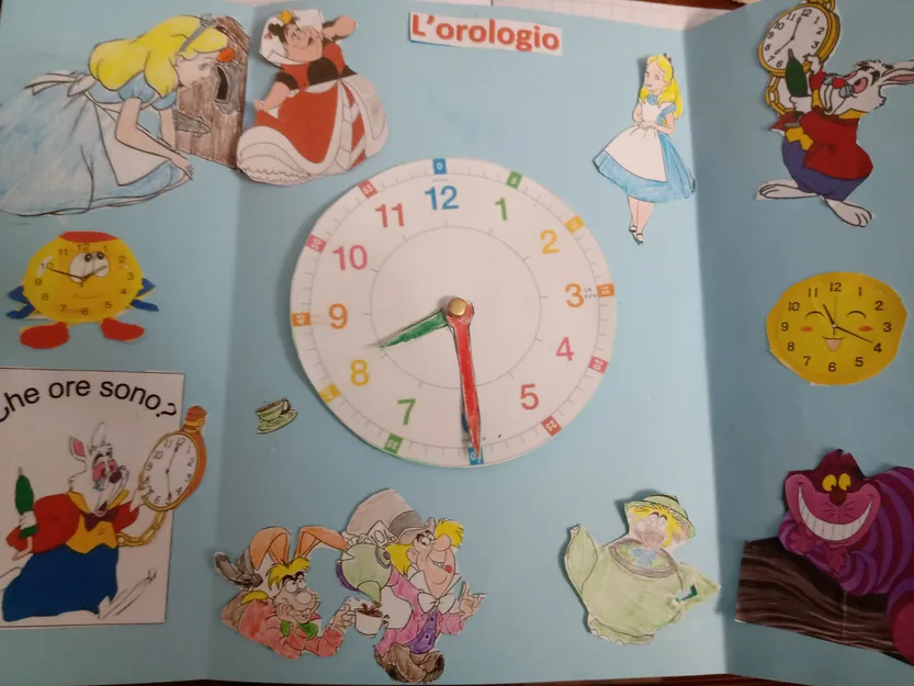 Lettura della fiaba e spiegazione dell'orologio ; Visione alla LIM del book- creator ; Realizzazione dell'orologio con il cartoncino; Realizzazione delle carte raffiguranti le ore e le azioni della giornata per il gioco del memory; Realizzazione del Lapbook. Word Wall.