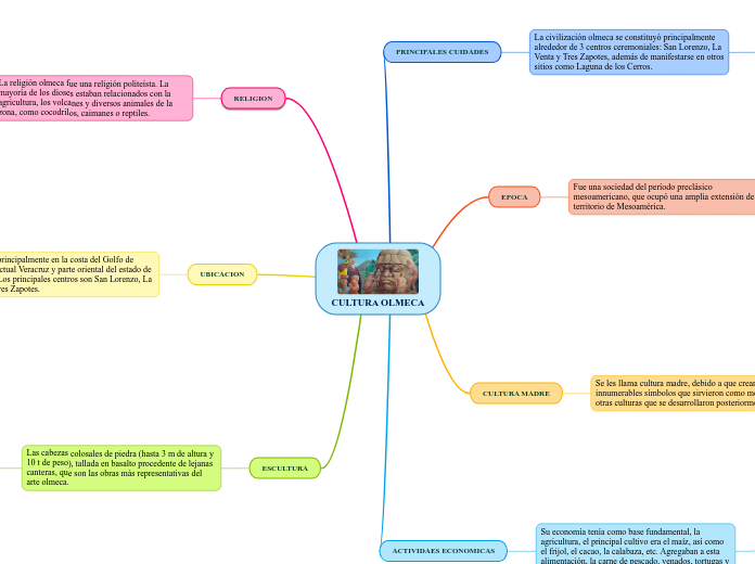 La civilización olmeca se constituyó principalmente alrededor de 3 centros ceremoniales: San Lorenzo, La Venta y Tres Zapotes, además de manifestarse en otros sitios como Laguna de los Cerros.