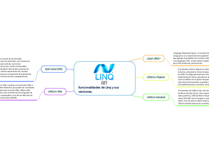 El proveedor de LINQ to XML convierte un documento XML a una colección de objetos XElement, que puede ser consultada usando el motor de ejecución local de LINQ. LINQ to XML utiliza las características más recientes de los lenguajes de .NET Framework y es comparable con la API de XML para el Modelo de objetos de documento (DOM).