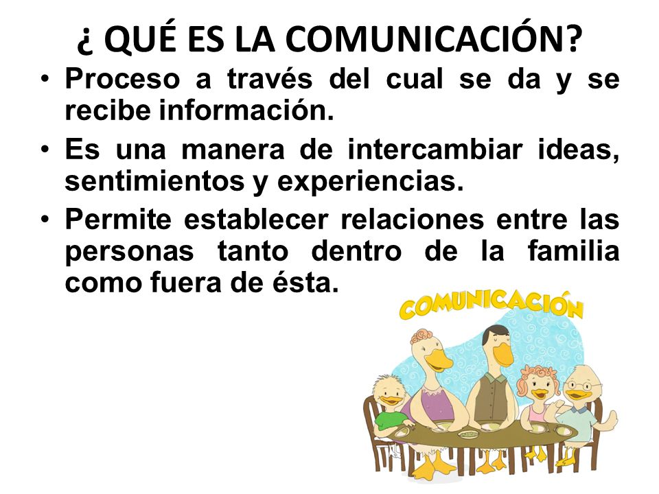 Proceso de interacción de personalidades, intercambio activo, transacción de ideas y sentimientos, elementos que permiten comprender su esencia.La comunicación familiar tiene una estructura compleja en donde figuran en todo momento no sólo mensajes interpersonales directos, sino un sistema de señales muy valiosas para que la persona que recibe el mensaje se percate de la categoría correcta a la que debe encuadrarse la secuencia de los mensajes transmitidos. Este sistema de señales constituye algo serio en forma literal o de metáforas. Tal serie de señales suele ser extraverbal y se modula mediante el tono de voz, la mímica y los gestos.
