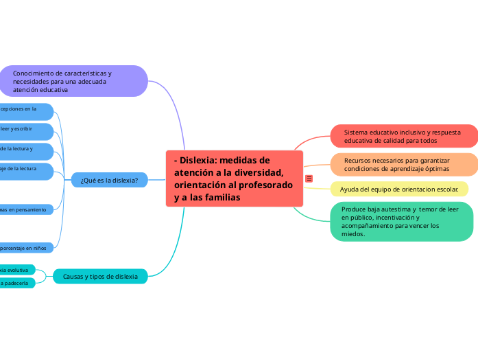 Dislexia; medidas de atención a la diversidad, orientación al profesorado y a las familias Un sistema educativo inclusivo se caracteriza por el ofrecimiento de una respuesta educativa de calidad a todo el alumnado, con independencia de sus circunstancias personales o sociales. Para garantizar dicha respuesta educativa, es necesario poner a disposición del alumnado y de la comunidad educativa en su conjunto una extensa gama de recursos personales, materiales y espacios que contribuyen a que el alumnado cuente con las condiciones necesarias para alcanzar el máximo rendimiento posible. El alumnado con necesidades específicas de apoyo educativo, se entiende como aquél que, en algún momento de su escolarización a lo largo de toda ella, requiere de ayudas específicas, medidas diferenciadas y recursos complementarios para desarrollar todo su potencial de aprendizaje. La atención a este alumnado implica, en primer lugar, el conocimiento de sus características, de sus necesidades y de las estrategias más eficaces para una adecuada atención educativa. ¿QUÉ ES LA DISLEXIA? Actualmente coexisten en la comunidad científica diferentes modelos teóricos en el abordaje de la dislexia, dando lugar a diferentes teorías y concepciones. Atendiendo a las características comunes encontradas en las diversas conceptualizaciones podemos decir que se llama dislexia a la incapacidad de origen neurobiológico que presentan algunas personas para leer y escribir correctamente, sin tener por otro lado, una discapacidad intelectual, motriz, visual o en cualquier otro ámbito que explique mejor dicho trastorno. La característica fundamental es una dificultad para la adquisición y uso de la lectura y la escritura. Desde la perspectiva educativa, la definición que más extensión está teniendo es la que identifica la dislexia como un trastorno específico del aprendizaje de la lectura de base neurobiológica, que afecta de manera persistente a la decodificación fonológica (exactitud lectora) y/o al reconocimiento de palabras (fluidez y velocidad lectora) interfiriendo en el rendimiento académico con un retraso lector de al menos dos años. Suele ir acompañado de problemas en la escritura. Se da en personas con un desarrollo cognitivo o inteligencia normal o alta. Es un trastorno que no puede ser explicado por discapacidad sensorial, física, motora o intelectual, ni por falta de oportunidades para el aprendizaje o factores socioculturales. Los problemas que presenta el alumnado con dislexia en el aula se concretan en distintas áreas: pensamiento, habla, lectura, escritura, deletreo y /o dificultad para manejar símbolos matemáticos. Es un importante factor de abandono de la escuela y la más frecuente de las dificultades en la lectura y el aprendizaje. El alumnado con dislexia constituye el 80% de los diagnósticos de los trastornos del aprendizaje situándose la prevalencia en torno al 2-8% de las niñas y niños escolarizados. Hay mayor porcentaje entre los niños que entre las niñas, y es bastante habitual que cuenten con antecedentes familiares, aunque dichos familiares no siempre hayan sido diagnosticados. Aunque tiene carácter evolutivo, también puede ser causada por traumatismo cerebral o por enfermedad. Suele estar asociada al trastorno del cálculo y de la expresión escrita, siendo relativamente raro hallar alguno de estos trastornos de manera aislada. También son frecuentes en las personas que la padecen los problemas de atención, que pueden acompañarse de impulsividad. Durante el periodo escolar pueden también aparecer problemas emocionales y de conducta. CAUSAS Y TIPOS DE DISLEXIA. Algunos autores y autoras distinguen entre los conceptos de dislexia adquirida y dislexia evolutiva. La dislexia adquirida es aquella que sobreviene tras una lesión cerebral concreta, mientras que la dislexia evolutiva es la que se presenta en el alumno o alumna que de forma inherente presentan dificultades para alcanzar una correcta destreza lectora, sin una razón aparente que lo explique. Actualmente se reconoce que existen factores hereditarios que predisponen a padecerla. CARACTERÍSTICAS DEL ALUMNADO CON DISLEXIA. Las investigaciones de los últimos años hablan de dislexia como síndrome que se manifiesta de múltiples formas. La mayoría de las personas disléxicas presentan algún tipo de déficit auditivo/fonológico, viso-espacial o psicomotor. Siempre se presentarán: • Dificultades en el lenguaje escrito. • Serias dificultades en la ortografía. • Lento aprendizaje de la lectura. • Dificultades para comprender y escribir segundas lenguas. A menudo, podrán presentarse: • Dificultades en matemáticas, especialmente en el aprendizaje de símbolos y series de cifras, como las tablas de multiplicación, problemas de memoria a corto plazo y de organización. • Dificultades para seguir instrucciones y secuencias complejas de tareas. • Problemas de comprensión de textos escritos. • Fluctuaciones muy significativas de capacidad. A veces, en función del tipo de dislexia o de cómo ésta haya afectado al alumno o alumna, pueden presentarse: • Dificultades en el lenguaje hablado. • Problemas de percepción de las distancias y del espacio. • Confusión entre la izquierda y la derecha. • Problemas con el ritmo y los lenguajes musicales. La dislexia presenta una sintomatología común, pero no necesariamente acumulada; pueden presentarse, a modo de aproximación, algunas de las siguientes características: DETECCIÓN DEL ALUMNADO CON POSIBLES NECESIDADES ESPECÍFICAS DE APOYO EDUCATIVO DERIVADAS DE DISLEXIA. Los síntomas de dislexia en un niño o niña suelen aparecer tempranamente, cuando se inicia el aprendizaje de la lectura y escritura. Así, es en la etapa de Educación Primaria cuando puede establecerse con firmeza el diagnóstico de dislexia y son fundamentalmente los maestros y maestras quienes en primer lugar pueden identificar la presencia de ciertas dificultad