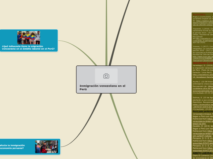 ECONOMÍA: Prialé,J (13/04/2020). Alonso Segura: Migración venezolana ya tendría impacto en mercado laboral. Gestión. Recuperado de :https://gestion.pe/economia/management-empleo/alonso-segura-migracion-venezolana-tendria-impacto-mercado-laboral-262194-noticia/ Yzquierdo, J.(2018). Consecuencias de la inmigración venezolana formal en la economía de la Región La Libertad, en el periodo 2013 – 2017 (Tesis de maestría, Universidad César Vallejo, Facultad de ciencias empresariales. Trujillo, Perú) Recuperado de:http://repositorio.ucv.edu.pe/bitstream/handle/UCV/27038/yzquierdo_sj.pdf?sequence=1&isAllowed=y [Consulta: 6 de abril del 2020] Jimenez, C.(2017). Configurando un país de destino para refugiados: La comunidad de Refugiados en el Perú en el periodo 2002 – 2017 y los retos para el Estado Peruano (Tesis de licenciatura,Pontificia Universidad Católica del Perú, facultad de Ciencias Sociales. Lima, Perú) Recuperado de: http://tesis.pucp.edu.pe/repositorio/bitstream/handle/20.500.12404/10132/JIMENEZ_ALEGRIA_CESAR_CONFIGURANDO.pdf?sequence=1&isAllowed=y [Consulta: 6 de abril del 2020] SEGURIDAD CIUDADANA: Verastegui, D. (2019). Las implicancias de la gestión de la migración venezolana en la seguridad multidimensional de Perú. (Tesis de licenciatura, USIL, facultad de Derecho. Lima-Perú). Recuperado de: http://repositorio.usil.edu.pe/bitstream/USIL/9513/1/2019_Verastegui-Sanchez.pdf Acuña.J. (22 DE Enero del 2020). Cifra de delincuente extranjeros crece exponencialmente en el país. Recuperado de: https://peru21.pe/peru/inseguridad-ciudadana-cifra-de-delincuentes-extranjeros-crece-exponencialmente-en-el-pais-noticia/?ref=p21r. [Consultado:23-04-2020] Salinas, E. (23 de Agosto del 2019). Venezolanos alertarán a sus compatriotas que cometan delitos. La República. Recuperado de: https://larepublica.pe/sociedad/2019/08/23/venezolanos-alertaran-sobre-sus-compatriotas-que-cometan-delitos/. [Consultado: 23-04-2020]. Perú país perfecto para un inmigrante venezolano:Araque, M. (2019, May 28). Venezolanos llegan a Perú por razones económicas, según la OIM. Retrieved from https://larepublica.pe/mundo/1210635-venezolanos-llegan-a-peru-por-razones-economicas-segun-la-oim/. Gestión, R. (2018, March 13). Mayoría de venezolanos llegan a Perú por razones económicas, según la OIM. Retrieved from https://gestion.pe/peru/politica/mayoria-venezolanos-llegan-peru-razones-economicas-segun-oim-229247-noticia/. Peruano, D. O. E. (n.d.). Migración y seguridad. Retrieved from https://elperuano.pe/noticia-migracion-y-seguridad-83543.aspx Peruano, D. O. E. (n.d.). Migración y seguridad. Retrieved from https://elperuano.pe/noticia-migracion-y-seguridad-83543.aspx ÁMBITO LABORAL: Diario El Comercio (2019) OIT impulsará integración laboral de venezolanos en distritos al norte de Lima (7 de mayo) Recuperado de: https://elcomercio.pe/economia/peru/venezuelavenezolanos-peru-oit-impulsara-integracion-laboral-venezolanos-distritos-norte-limanoticia-633140 (2018a) CCL: Existen 11.9 millones de trabajadores informales. (28 de abril de 2018) Recuperado de: https://gestion.pe/economia/ccl-existen-11-9-millones-trabajadores-informales-234620 (2018b) INEI: Empleo informal en el país sigue creciendo más que el formal. (15 de mayo) Recuperado de: https://gestion.pe/economia/inei-informal-pais-sigue-creciendoformal-266936