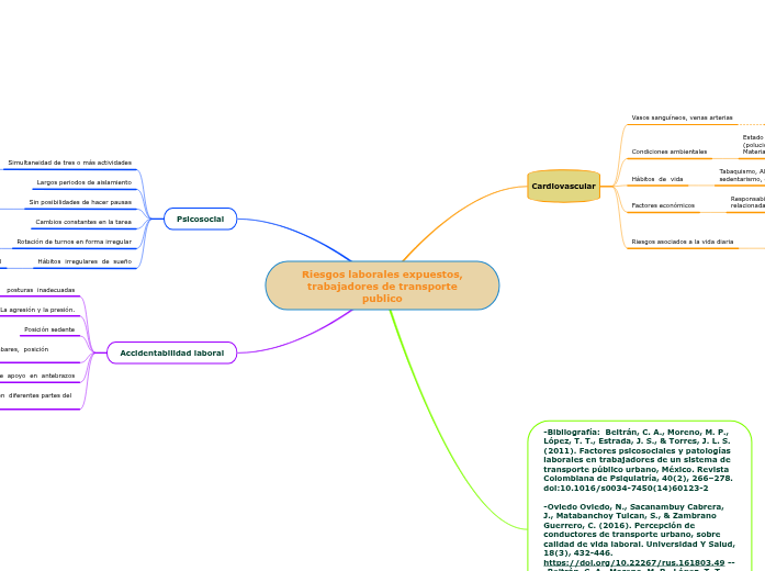 -Bibliografía: Beltrán, C. A., Moreno, M. P., López, T. T., Estrada, J. S., & Torres, J. L. S. (2011). Factores psicosociales y patologías laborales en trabajadores de un sistema de transporte público urbano, México. Revista Colombiana de Psiquiatría, 40(2), 266–278. doi:10.1016/s0034-7450(14)60123-2 -Oviedo Oviedo, N., Sacanambuy Cabrera, J., Matabanchoy Tulcan, S., & Zambrano Guerrero, C. (2016). Percepción de conductores de transporte urbano, sobre calidad de vida laboral. Universidad Y Salud, 18(3), 432-446. https://doi.org/10.22267/rus.161803.49 ---Beltrán, C. A., Moreno, M. P., López, T. T., Estrada, J. S., & Torres, J. L. S. (2011). Factores psicosociales y patologías laborales en trabajadores de un sistema de transporte público urbano, México. Revista Colombiana de Psiquiatría, 40(2), 266–278. doi:10.1016/s0034-7450(14)60123-2