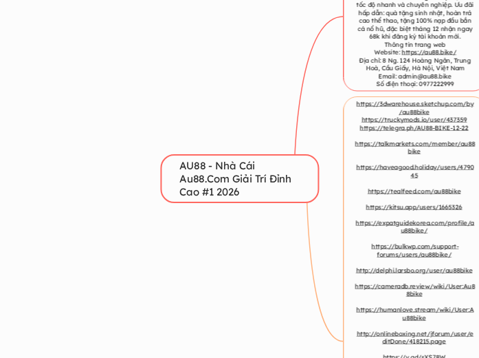 AU88 là nhà cái giải trí trực tuyến hàng đầu tại Châu Á, mang đến trải nghiệm đa dạng với các sảnh game hấp dẫn như: Cá cược thể thao, Bắn cá nổ hũ, Đá gà trực tiếp, Casino trực tuyến, Xổ số 3 miền,... Đội ngũ chăm sóc khách hàng của AU88 luôn sẵn sàng hỗ trợ 24/7 với tốc độ nhanh và chuyên nghiệp. Ưu đãi hấp dẫn: quà tặng sinh nhật, hoàn trả cao thể thao, tặng 100% nạp đầu bắn cá nổ hũ, đặc biệt tháng 12 nhận ngay 68k khi đăng ký tài khoản mới. Thông tin trang web Website: https://au88.bike/ Địa chỉ: 8 Ng. 124 Hoàng Ngân, Trung Hoà, Cầu Giấy, Hà Nội, Việt Nam Email: admin@au88.bike Số điện thoại: 0977222999