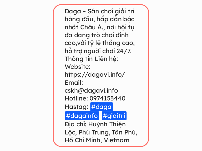 Daga – Sân chơi giải trí hàng đầu, hấp dẫn bậc nhất Châu Á., nơi hội tụ đa dạng trò chơi đỉnh cao,với tỷ lệ thắng cao, hỗ trợ người chơi 24/7. Thông tin Liên hệ: Website: https://dagavi.info/ Email: cskh@dagavi.info Hotline: 0974153440 Hastag: #daga #dagainfo #giaitri Địa chỉ: Huỳnh Thiện Lộc, Phú Trung, Tân Phú, Hồ Chí Minh, Vietnam