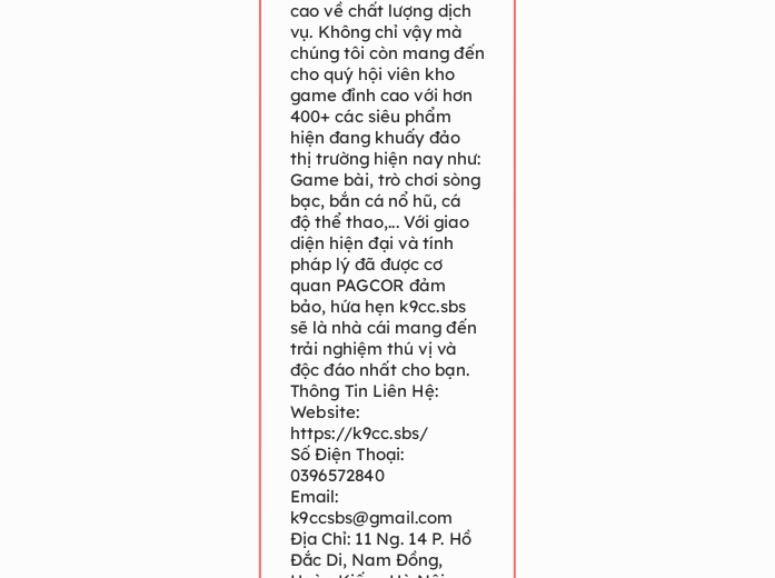 K9CC là sân chơi thú vị và hấp dẫn số 1 được đông đảo người dùng Việt Nam lẫn các khách hàng quốc tế đánh giá cao về chất lượng dịch vụ. Không chỉ vậy mà chúng tôi còn mang đến cho quý hội viên kho game đỉnh cao với hơn 400+ các siêu phẩm hiện đang khuấy đảo thị trường hiện nay như: Game bài, trò chơi sòng bạc, bắn cá nổ hũ, cá độ thể thao,... Với giao diện hiện đại và tính pháp lý đã được cơ quan PAGCOR đảm bảo, hứa hẹn k9cc.sbs sẽ là nhà cái mang đến trải nghiệm thú vị và độc đáo nhất cho bạn. Thông Tin Liên Hệ: Website: https://k9cc.sbs/ Số Điện Thoại: 0396572840 Email: k9ccsbs@gmail.com Địa Chỉ: 11 Ng. 14 P. Hồ Đắc Di, Nam Đồng, Hoàn Kiếm, Hà Nội, Việt Nam #k9cc #k9cc_sbs #nhacaik9cc #dangnhapk9cc