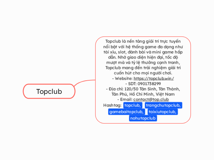 Topclub là nền tảng giải trí trực tuyến nổi bật với hệ thống game đa dạng như tài xỉu, slot, đánh bài và mini game hấp dẫn. Nhờ giao diện hiện đại, tốc độ mượt mà và tỷ lệ thưởng cạnh tranh, Topclub mang đến trải nghiệm giải trí cuốn hút cho mọi người chơi. - Website: https://topclub.win/ - SDT: 0901738299 - Địa chỉ: 120/50 Tân Sinh, Tân Thành, Tân Phú, Hồ Chí Minh, Việt Nam - Email: contact@top.club Hashtag: topclub,trangchutopclub,gamebaitopclub,taixiutopclub,nohutopclub