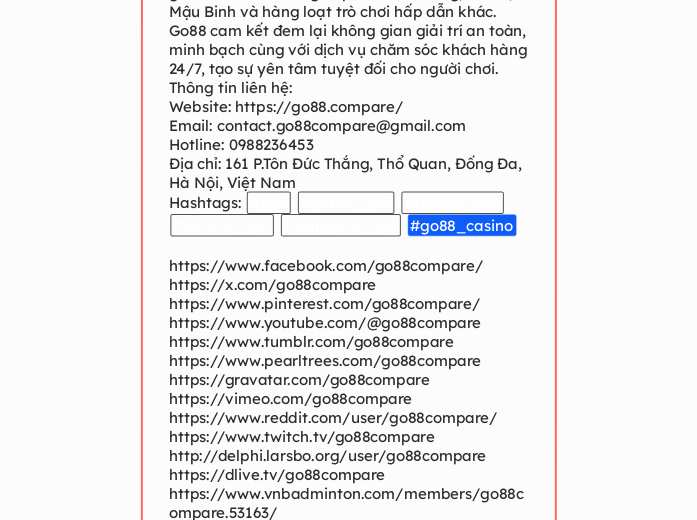 Trải nghiệm đẳng cấp tại Go88 với hàng loạt game bài đổi thưởng hấp dẫn như Liêng, Phỏm, Mậu Binh và hàng loạt trò chơi hấp dẫn khác. Go88 cam kết đem lại không gian giải trí an toàn, minh bạch cùng với dịch vụ chăm sóc khách hàng 24/7, tạo sự yên tâm tuyệt đối cho người chơi. Thông tin liên hệ: Website: https://go88.compare/ Email: contact.go88compare@gmail.com Hotline: 0988236453 Địa chỉ: 161 P.Tôn Đức Thắng, Thổ Quan, Đống Đa, Hà Nội, Việt Nam Hashtags: #go88 #game_go88 #taiapp_go88 #nhacai_go88 #trangchu_go88 #go88_casino https://www.facebook.com/go88compare/ https://x.com/go88compare https://www.pinterest.com/go88compare/ https://www.youtube.com/@go88compare https://www.tumblr.com/go88compare https://www.pearltrees.com/go88compare https://gravatar.com/go88compare https://vimeo.com/go88compare https://www.reddit.com/user/go88compare/ https://www.twitch.tv/go88compare http://delphi.larsbo.org/user/go88compare https://dlive.tv/go88compare https://www.vnbadminton.com/members/go88compare.53163/ https://qna.habr.com/user/go88compare https://mstdn.business/@go88compare