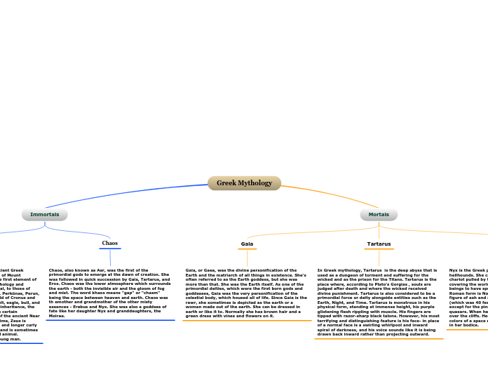 Chaos, also known as Aer, was the first of the primordial gods to emerge at the dawn of creation. She was followed in quick succession by Gaia, Tartarus, and Eros. Chaos was the lower atmosphere which surrounds the earth - both the invisible air and the gloom of fog and mist. The word khaos means "gap" or "chasm" being the space between heaven and earth. Chaos was th emother and grandmother of the other misty essences - Erebus and Nyx. She was also a goddess of fate like her daughter Nyx and granddaughters, the Moirae.