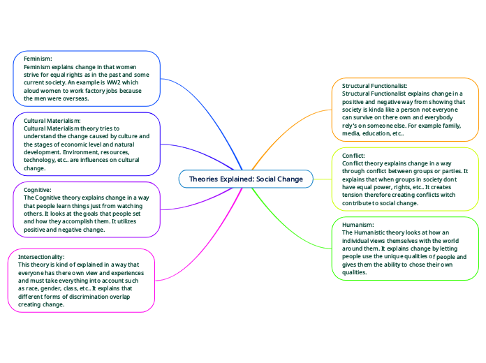 Feminism: Feminism explains change in that women strive for equal rights as in the past and some current society. An example is WW2 which aloud women to work factory jobs because the men were overseas.