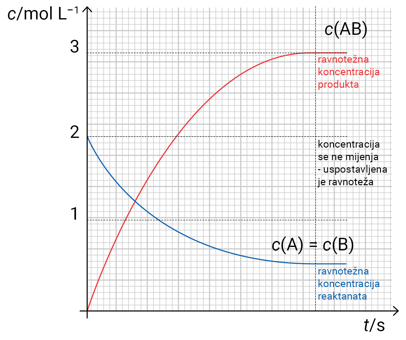 GRAFIČKI PRIKAZ: promjene koncentracija reaktanata i produkata u ovisnosti o vremenu i postizanju ravnotežnih koncentracija