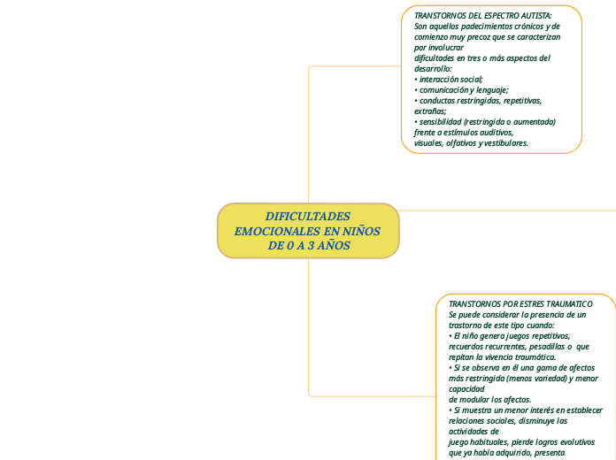 TRANSTORNOS POR ESTRES TRAUMATICO Se puede considerar la presencia de un trastorno de este tipo cuando: • El niño genera juegos repetitivos, recuerdos recurrentes, pesadillas o que repitan la vivencia traumática. • Si se observa en él una gama de afectos más restringida (menos variedad) y menor capacidad de modular los afectos. • Si muestra un menor interés en establecer relaciones sociales, disminuye las actividades de juego habituales, pierde logros evolutivos que ya había adquirido, presenta dificultades para dormir o terrores y despertares nocturnos. • Si presenta un estado de mayor excitación con vigilancia extrema del medio que lo rodea y reacciones sobresaltadas frente a los estímulos que recibe.