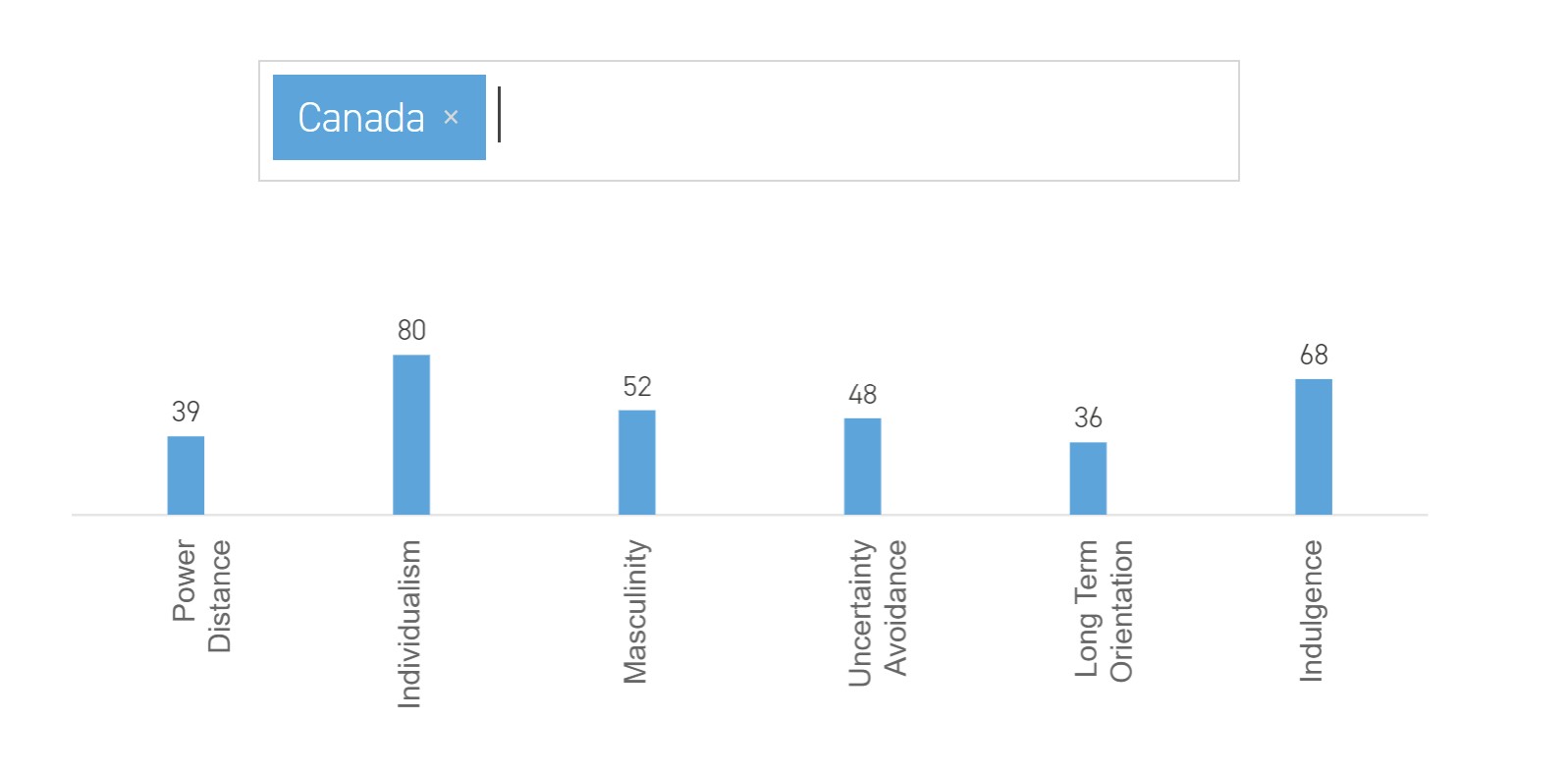 Canada's score is about half of the average of our chosen African countries. We relate to the power distance of africa's ratio in terms of family structure. We do believe in a hierarchy, and usually elders in a family structure, or distanet family have more "power" and we see this as respect. However, as functioning people of a society, we do identify with canada more ( we would rather less of a hierarchy in work environments and social environments, we see this as more equality)