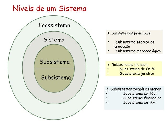 Um sistema pode se compor, sucessivamente, de subsistemas (também conjunto de partes interdependentes que se relacionam entre si, compondo o sistema maior).