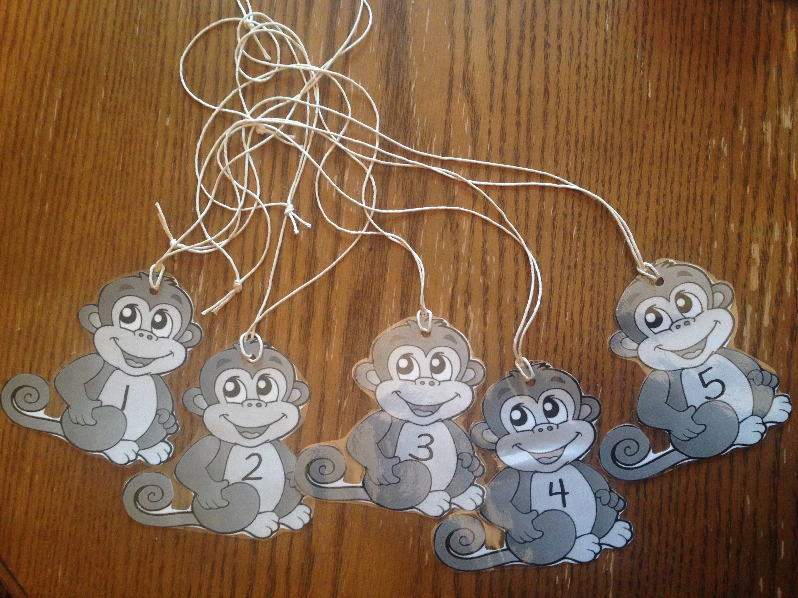 5 students can wear these tags. When the monkey falls off the bed the teacher writes the subtraction equation on the smart board.