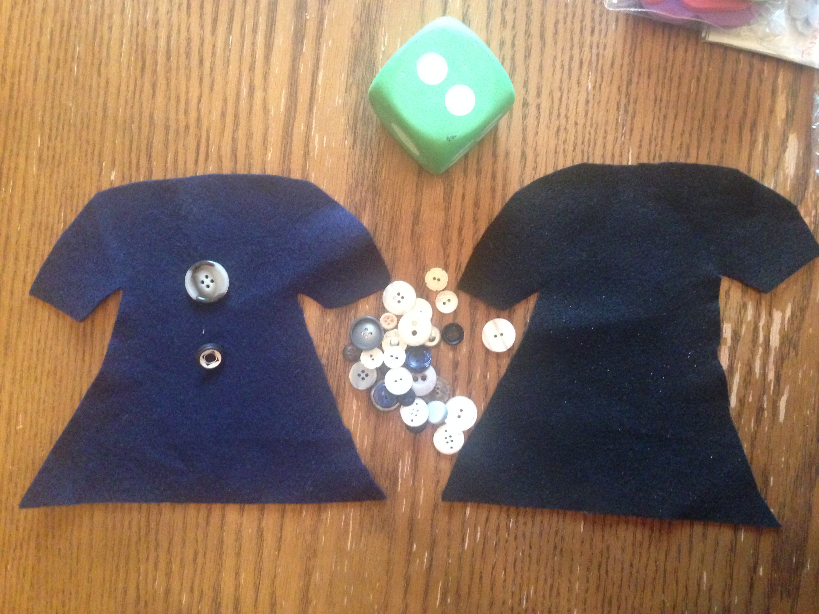 In this center students role the dice. They determine the number on the dice and put the same number of groovy buttons on the shirt.