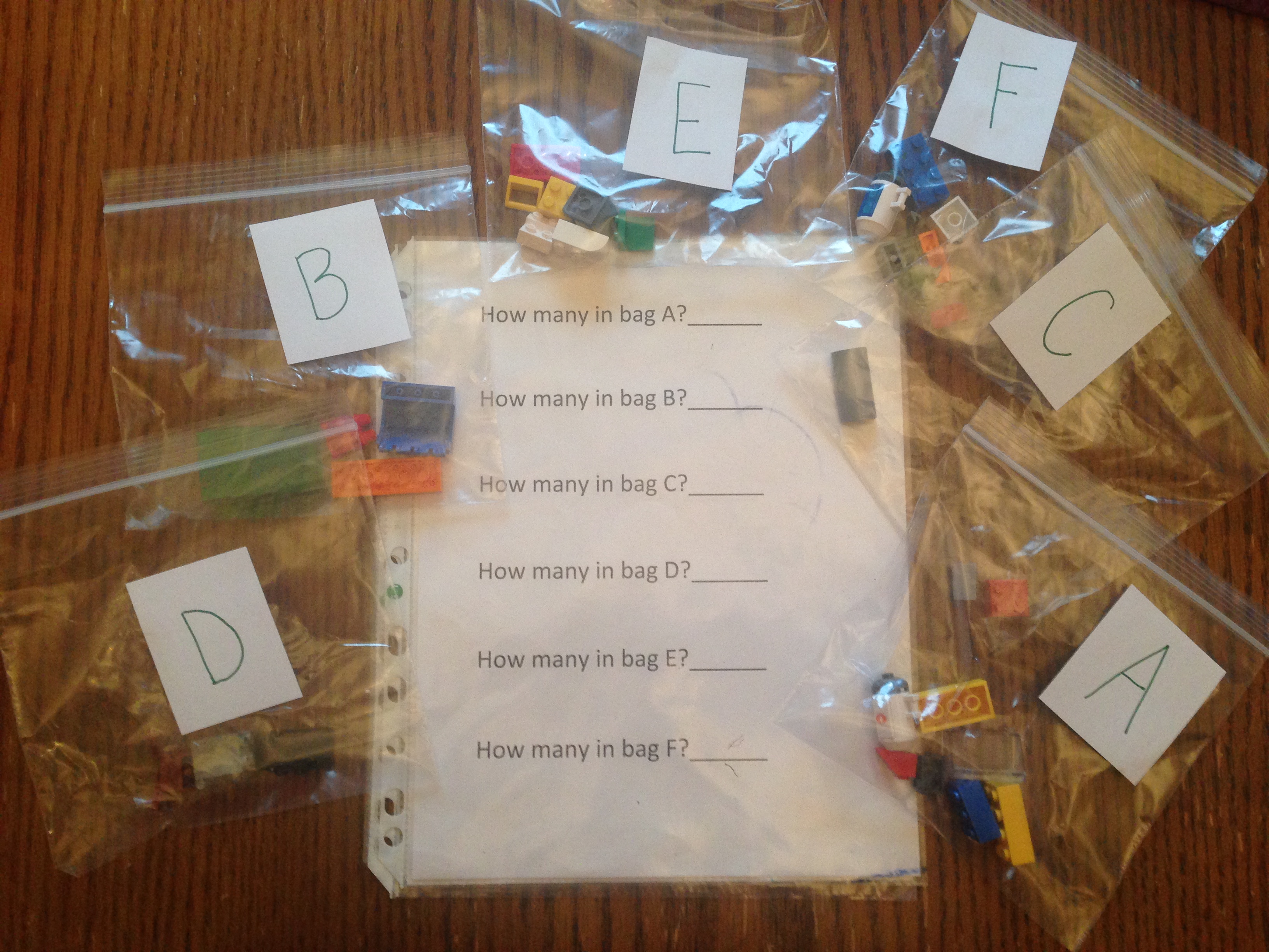 This center are several bags that contain objects. Students can move the objects around in the bags to count them. Each bag is labelled with a letter. Students record the amount of objects in each bag on the sheet.
