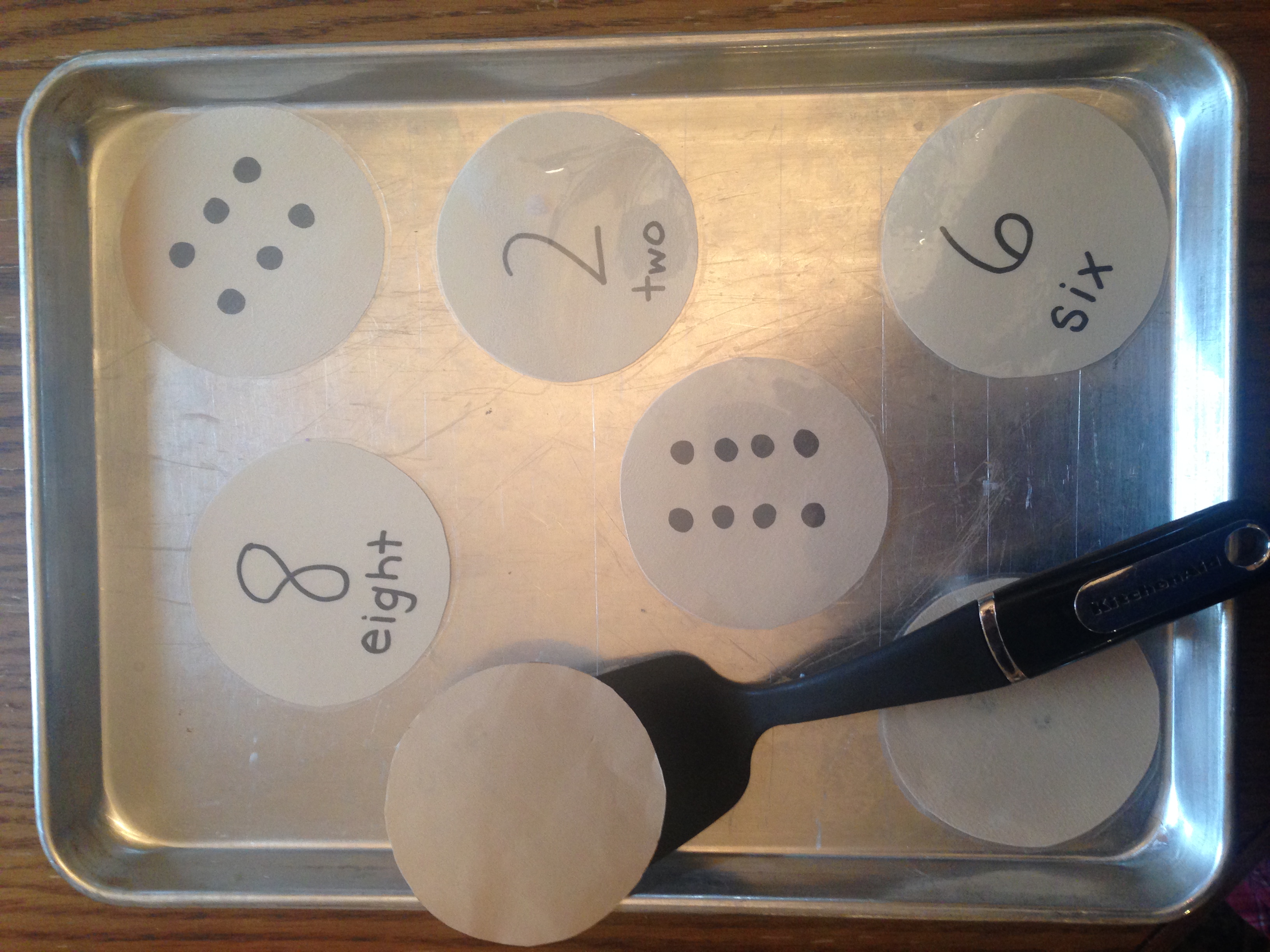 In this center Students are making and cooking cookies in the kitchen. They are using a flipper to turn over the cookies to determine which set of chocolate chips matches which number.