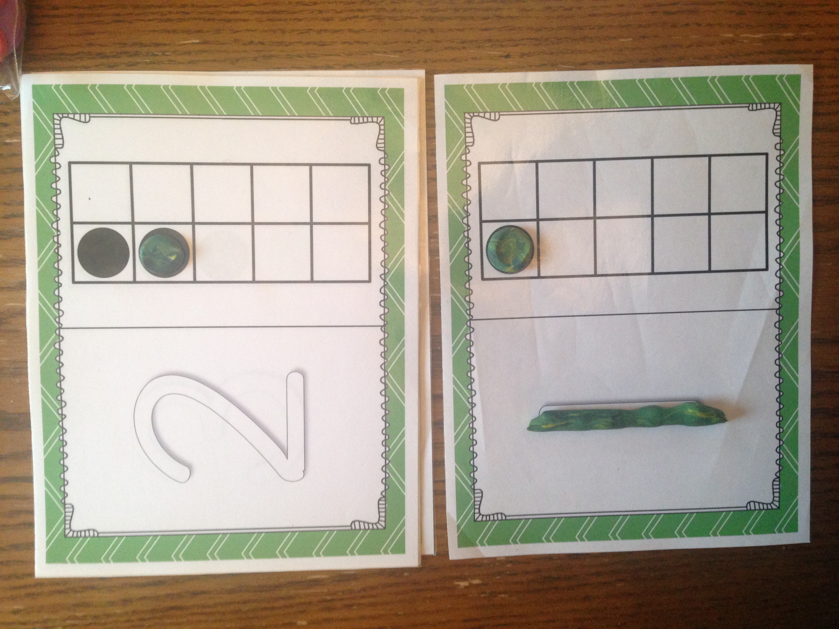 Students practice early numeracy by rolling playdough into the number symbols. They also make balls to squish into the 10 frames to represent each number.
