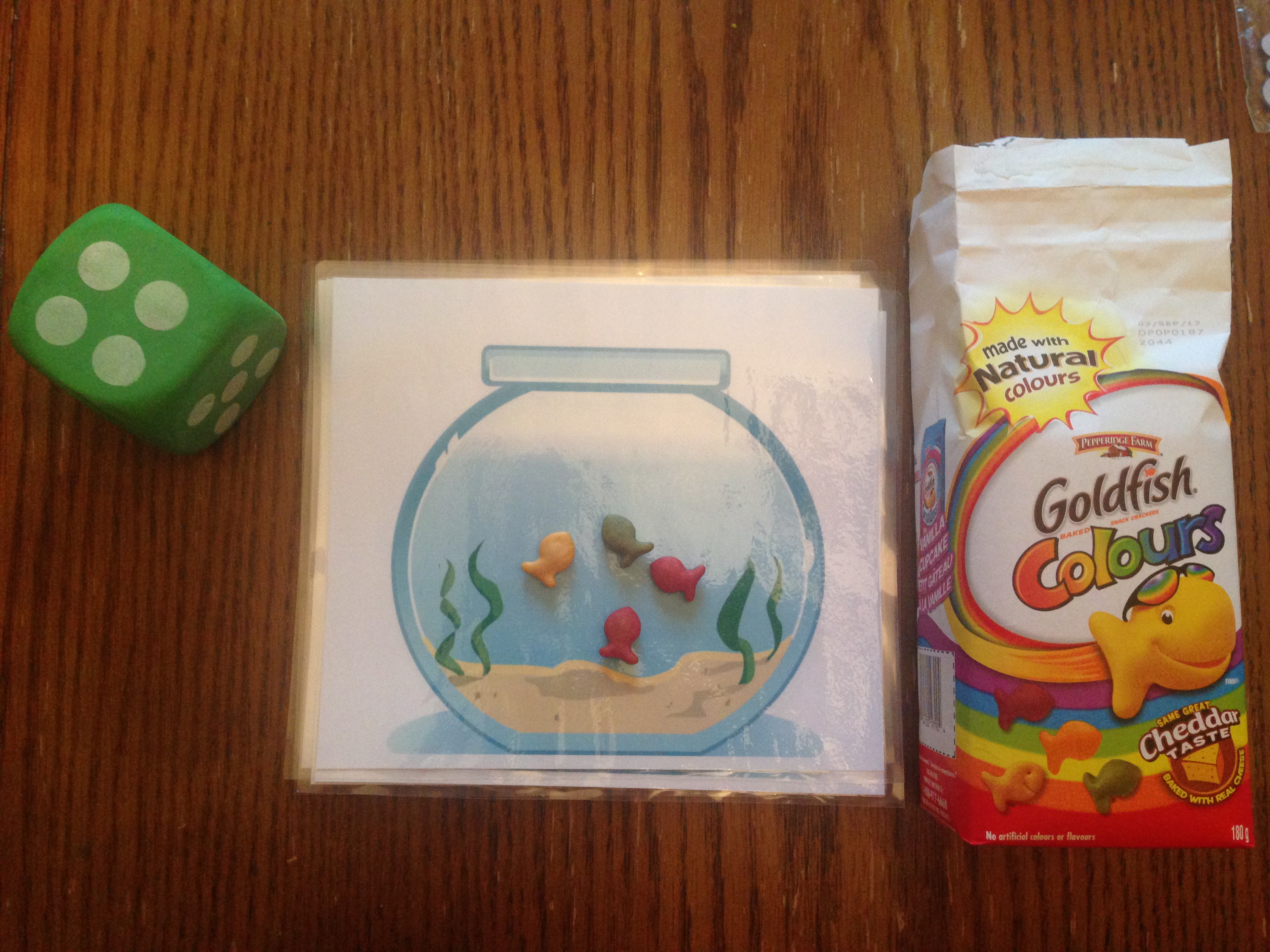 This center engages children with goldfish crackers on a bowl placemat. They role the die and put the corresponding number of goldfish onto the bowl.