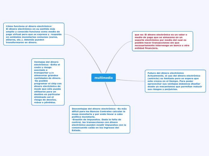 Desventajas del dinero electrónico: -Es más difícil para los Bancos Centrales calcular la masa monetaria y por ende llevar a cabo política monetaria. -Evasión de impuestos. Dada la falta de control, las transacciones con dinero electrónico pueden evadir impuestos con la consecuente caída en los ingresos del Estado.